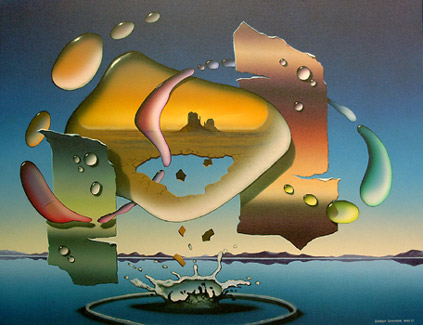 The composition is rooted in geometric surrealism, where precise structure contrasts with organic deterioration. Instead of chaos, the decay is measured and deliberate, suggesting that erosion itself follows a hidden order. The suspended forms feel preserved in a moment outside time, inviting reflection on cycles of change, entropy, and renewal.